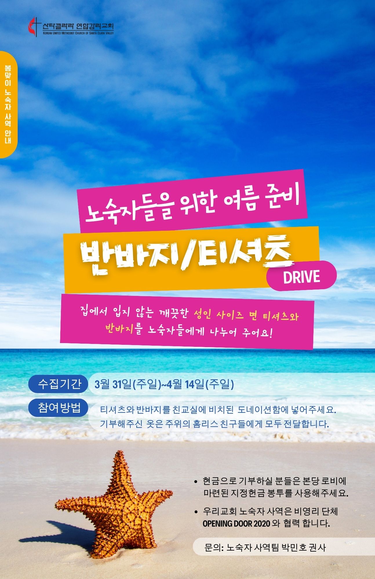 - 관심과 후원이 필요합니다: 우리 교회는, Opening Door 2020 라는 비영리 단체와 손잡고, 지속적인 지원을 통해 더 많은 노숙자들에게 도움이 닿을 수 있도록 노력하고 있습니다. 이 사역을 위해서 주중에 진행되는 현장사역 지원과 지정헌금 등으로 함께 할 수 있습니다. 지정헌금은 비치된 헌금봉투를 이용해 주세요.