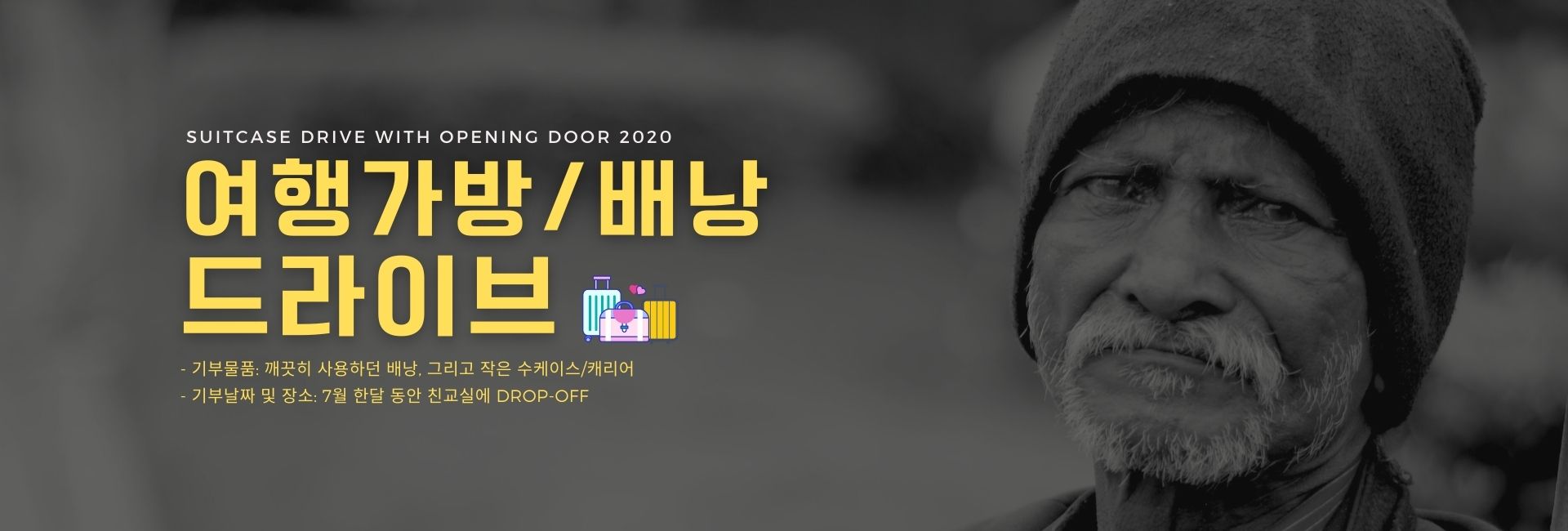 지금 홈리스 이웃들이 가장 필요로 하는것들 중에 하나가 배낭이나 조그만 수케이스 라고 합니다. 성도님 가정에 혹시, 지금은 사용하지 않으시는 배낭이나 수케이스/캐리어를 교회 친교실로 가져오시면, 7월 한달간 (7/13, 7/20, 7/27) 모아서, Opening Doors 2020 에게 잘 전달해, 홈리스 이웃들에게 많은 쓰임이 되도록 하겠습니다.