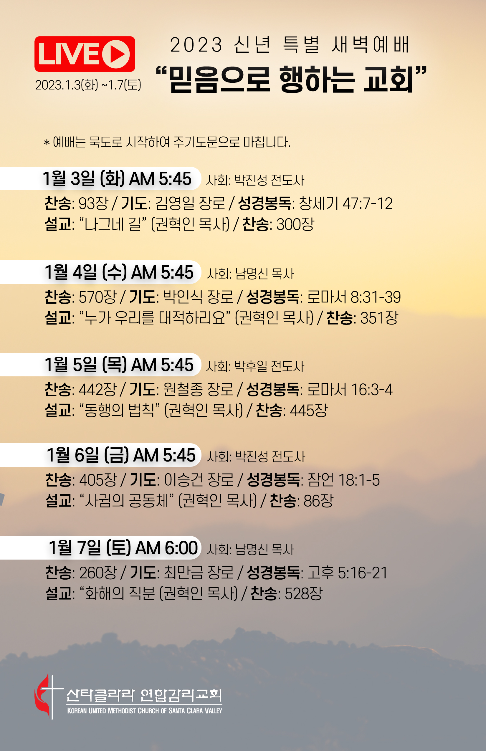 이번 한주간 새벽을 깨워 믿음으로 한해를 시작하는 귀한 은혜를 누리시기 바랍니다.