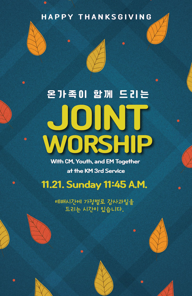 11월 21일 (주일) 11:45 CM, Youth, EM에서 3부예배에 함께 참여하여 예배를 드립니다.