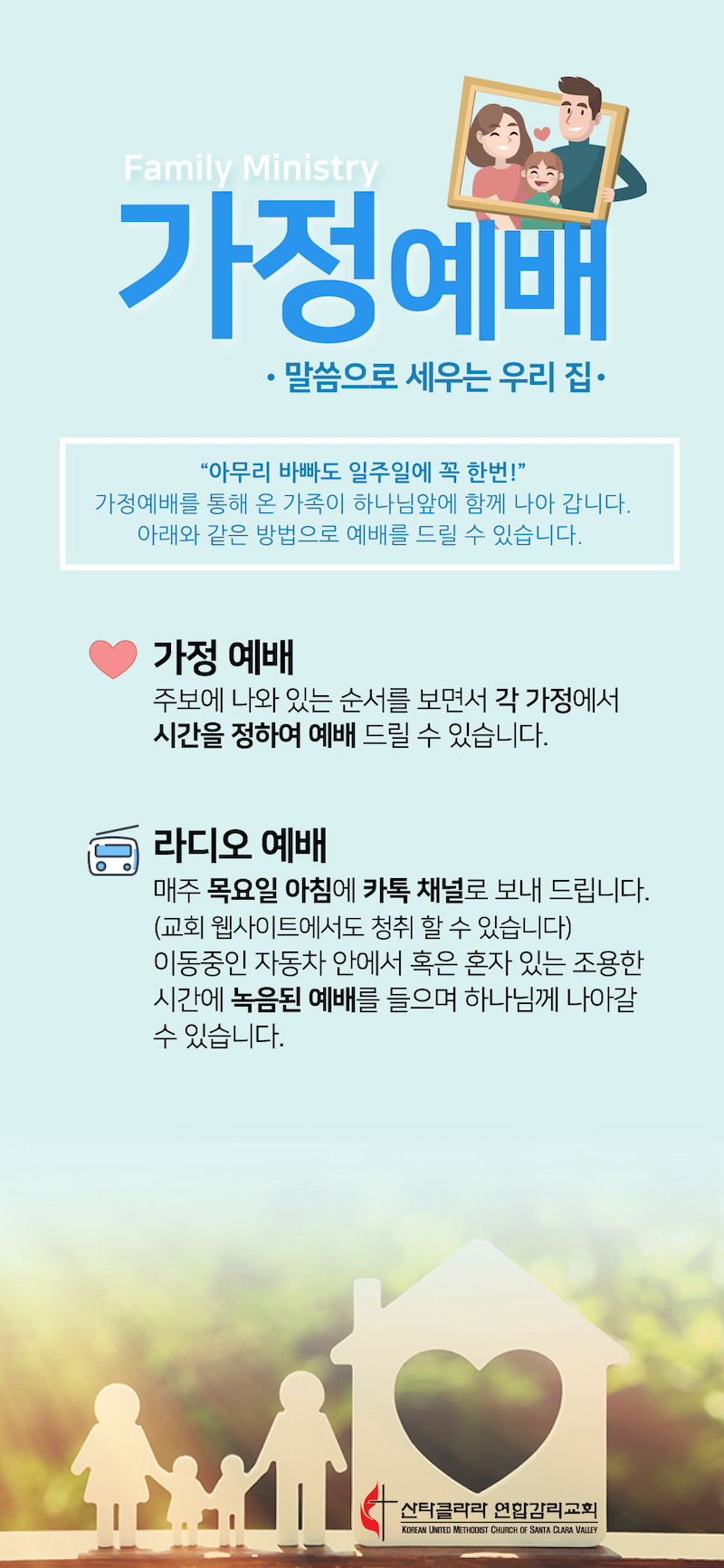 - 가정 예배: 주보에 나와 있는 순서를 보면서 각 가정에서 시간을 정하여 예배를 드릴 수 있습니다.