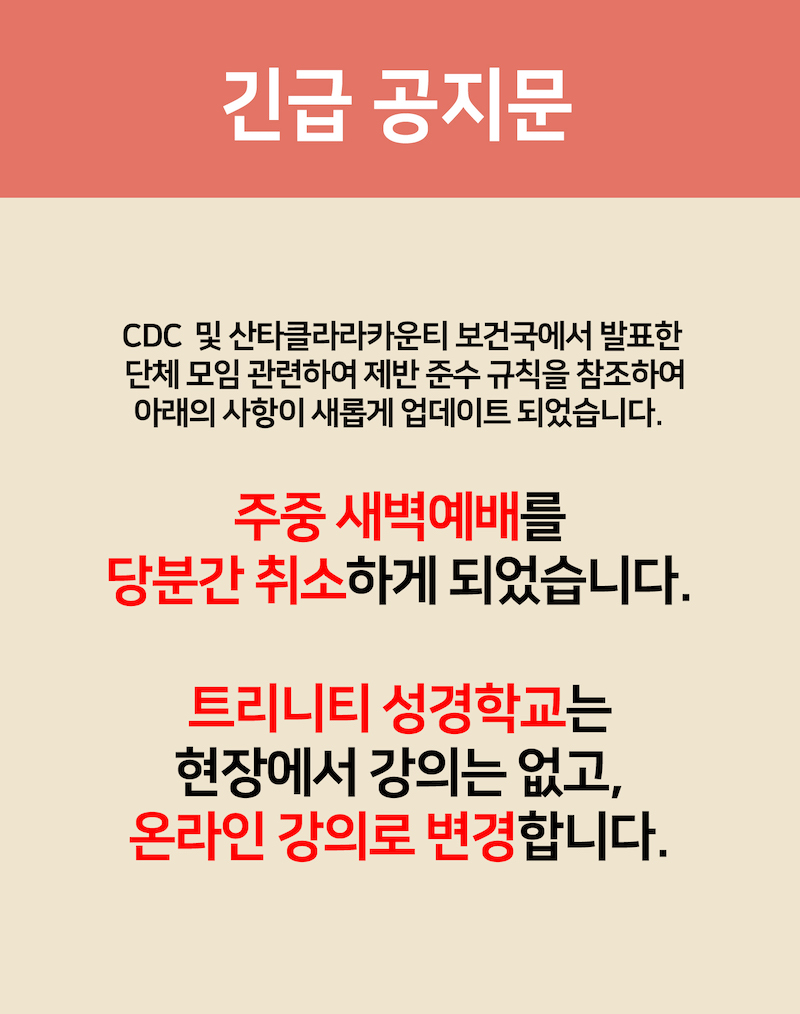 그 준수규칙에 따라 트리니티 성경학교에서도 아래와 같이 운영 방법을 변경합니다.
