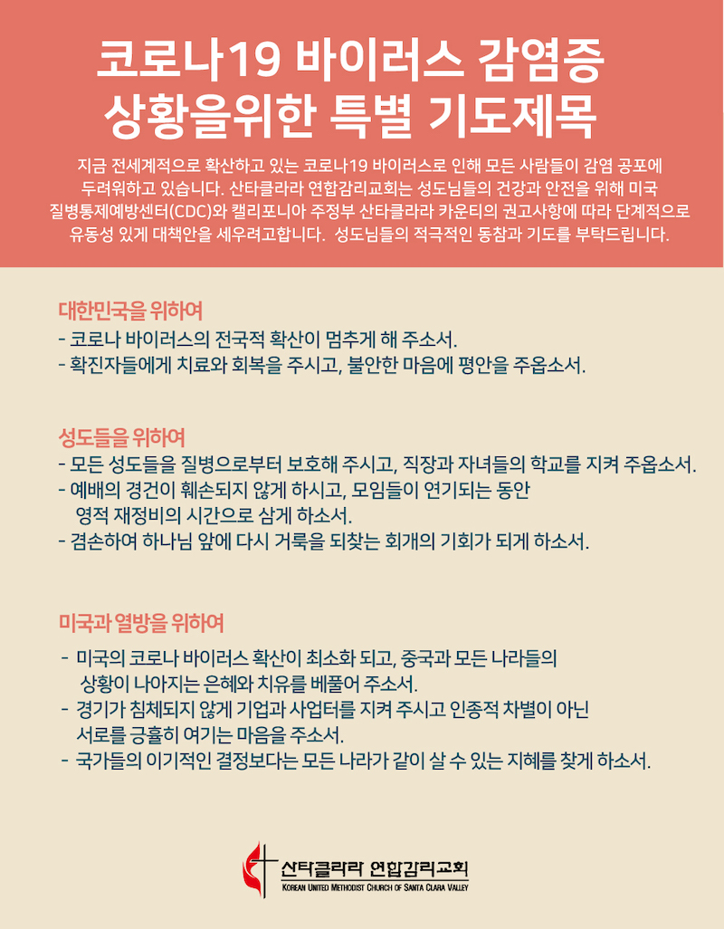코로나바이러스 상황을 위한 기도제목 Publish on July 09,2020 | 관리자 페이지 정보 작성자 관리자 댓글 0건 조회 8,134회 작성일 20-07-09 14:31 목록 본문 이전글2020 성금요일예배 20.07.09 다음글새벽예배 및 트리니티 성경학교 안내 20.03.16 댓글 0 댓글목록 등록된 댓글이 없습니다. 목록