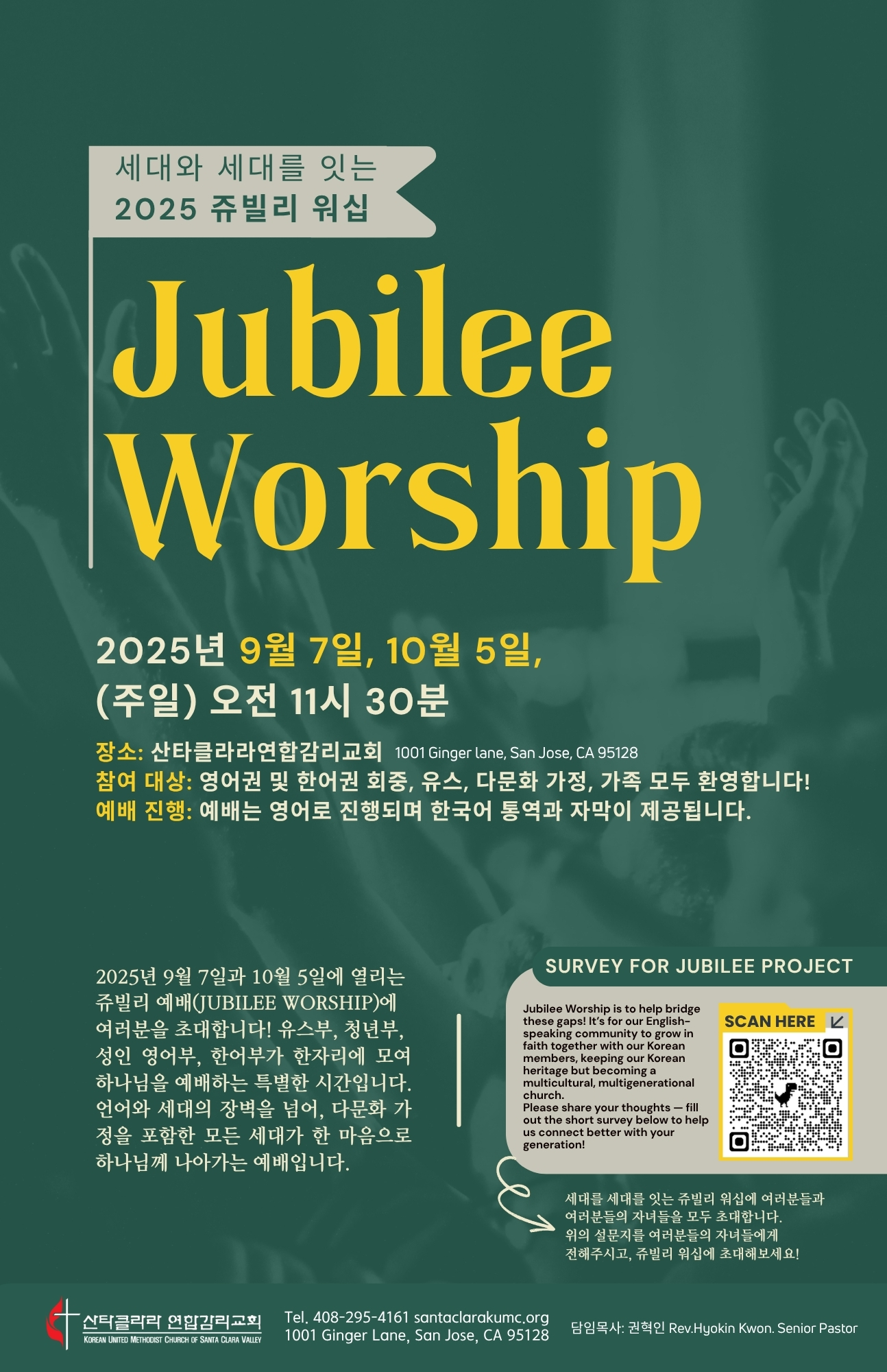 우리 교회는 2025년 9월 7일과 10월 5일 오전 11시 30분에 쥬빌리 예배(Jubilee Worship)를 드리며, 유스, 영어부, 한어부(2부)가 한자리에 모여 하나님을 예배하는 특별한 시간을 준비하고 있습니다.