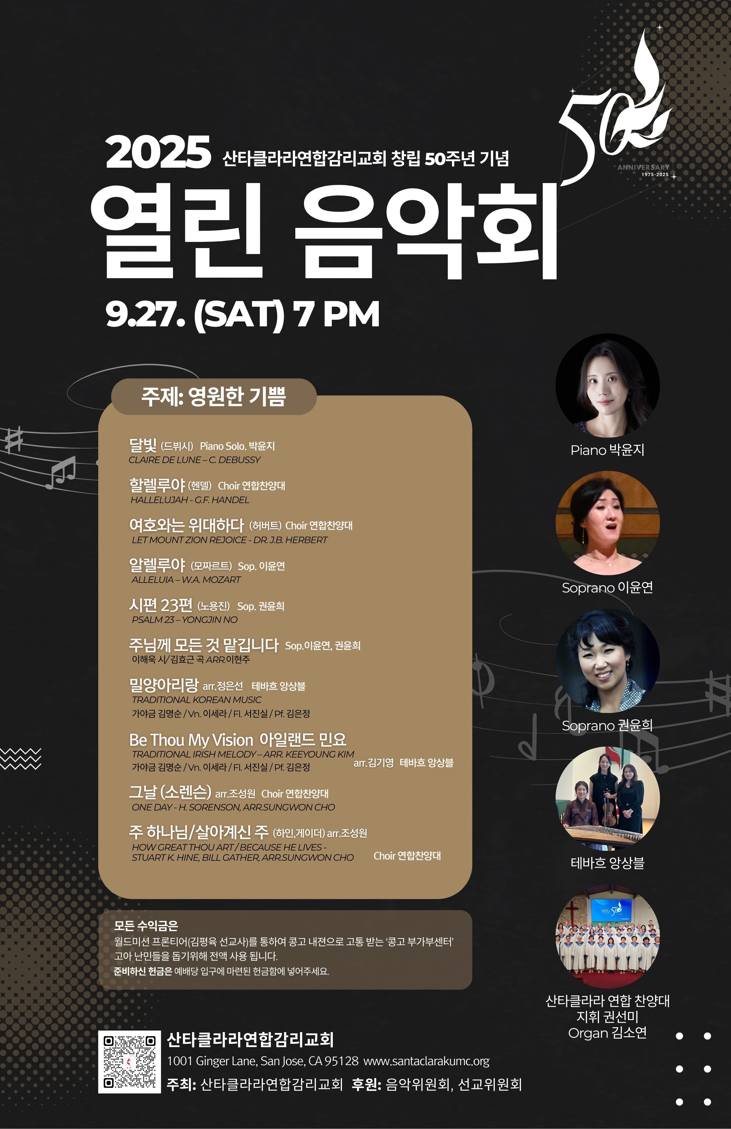 음악위원회와 선교위원회의 후원으로 진행되는 이번 열린 음악회는 우리교회 연합찬양대와 여러 다양한 연주자들이 함께 참여하여 ‘영원한 기쁨’이라는 주제로 창립 50주년을 허락하신 하나님께 영광을 올려드리는 시간입니다. 이 뜻깊은 시간을 위해 기도로 함께 해주시고 성도님들의 많은 참여를 부탁드립니다.