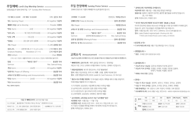 - 이전글2019년 10월 6일 교회소식 19.10.10