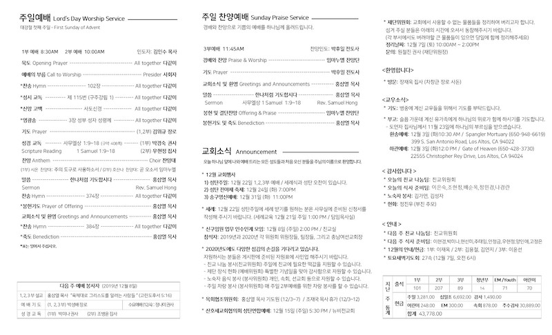 [주보] 2019년 11월 24일 - 추수감사주일 Publish on November 30,2019 | 관리자 페이지 정보 작성자 관리자 댓글 0건 조회 7,224회 작성일 19-11-30 09:21 목록 본문 이전글[교회소식] 2019년 11월 24일 19.11.30 다음글추수감사주일 3부 특별예배 19.11.20 댓글 0 댓글목록 등록된 댓글이 없습니다. 목록