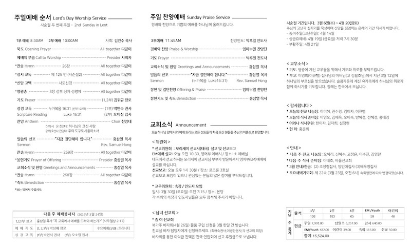 주보 [2019년 3월 17일] Publish on March 22,2019 | 관리자 페이지 정보 작성자 관리자 댓글 0건 조회 6,861회 작성일 19-03-22 10:10 목록 본문 이전글2019 VBS (여름성경학교) 안내 19.06.19 다음글주보 [2019년 3월 10일] 19.03.22 댓글 0 댓글목록 등록된 댓글이 없습니다. 목록