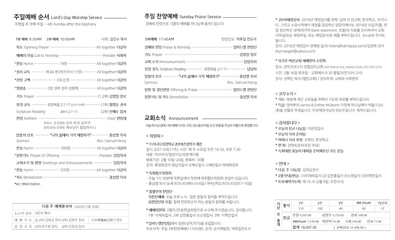 2019년 2월 3일 주보 Publish on February 12,2019 | 관리자 페이지 정보 작성자 관리자 댓글 0건 조회 6,545회 작성일 19-02-12 20:02 목록 본문 2019년 2월 3일 주보 이전글2019년 2월 10일 주보 19.02.12 다음글북가주 여선교회 새해맞이 수련회 19.02.09 댓글 0 댓글목록 등록된 댓글이 없습니다. 목록