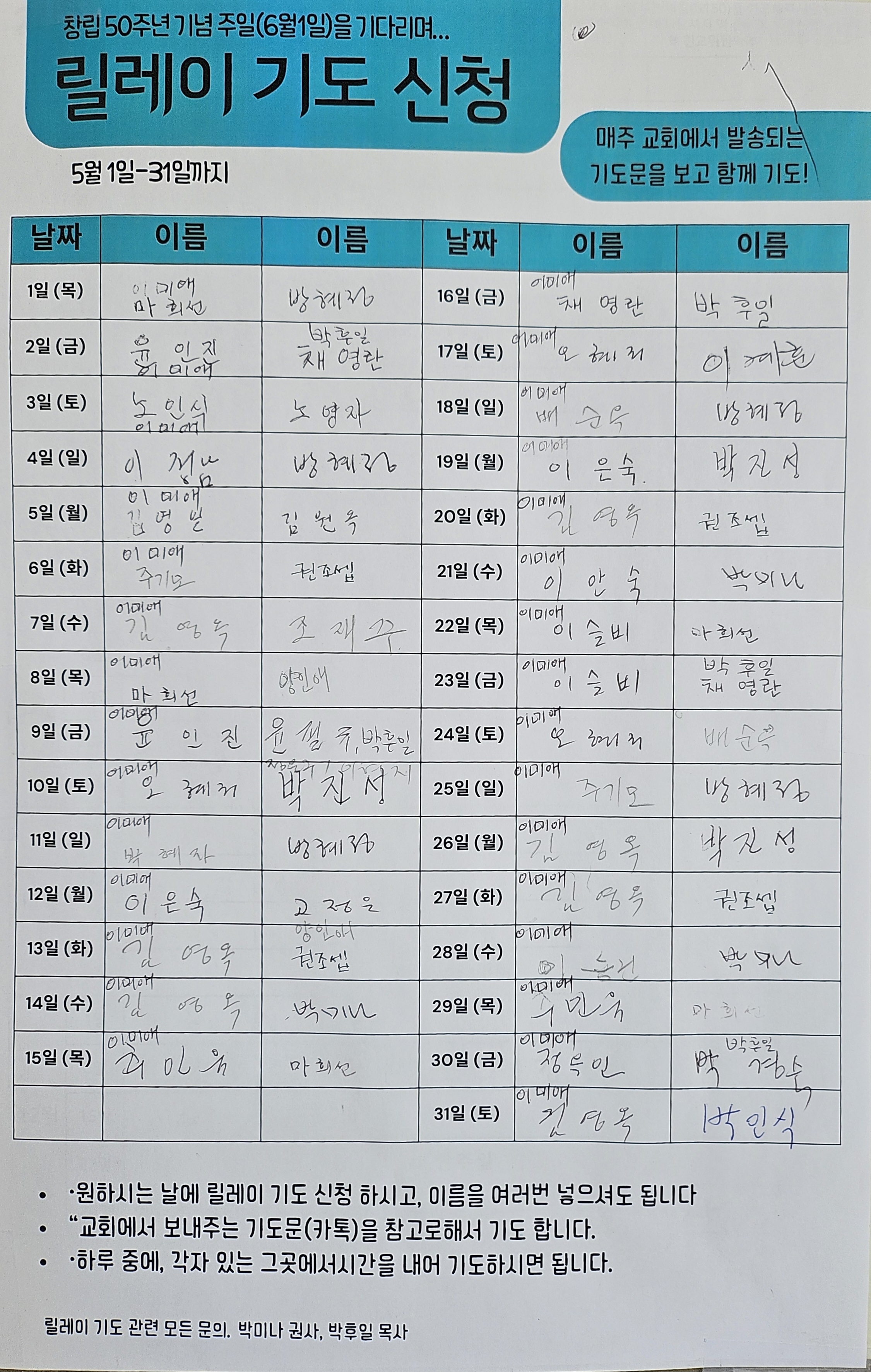 창립 50주년을 감사함으로 하나님께 올려드리고 새로운 소망과 믿음으로 나아가는 우리 교회 공동체가 되기 위해 릴레이 기도에 많은 성도님들이 참여해 주시기 바랍니다.