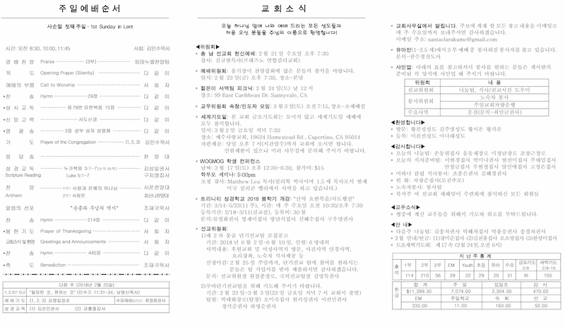 2018년 02월 18일 Publish on February 21,2018 | 교회사무실 페이지 정보 작성자 교회사무실 댓글 0건 조회 6,579회 작성일 18-02-21 08:39 목록 본문 이전글WOGMOG 학생 컨퍼런스 및 학부모 세미나 18.03.12 다음글2018년 02월 11일 18.02.21 댓글 0 댓글목록 등록된 댓글이 없습니다. 목록