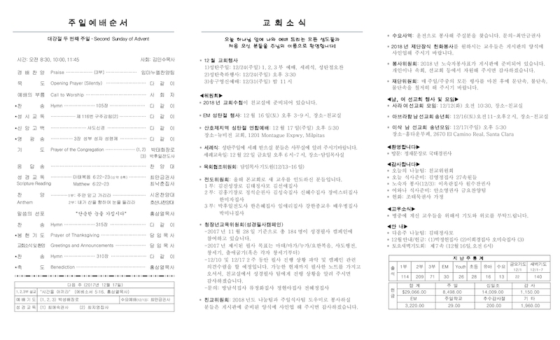 2017년 12월 10일 Publish on December 10,2017 | 교회사무실 페이지 정보 작성자 교회사무실 댓글 0건 조회 6,413회 작성일 17-12-10 11:38 목록 본문 이전글2017년 12월 17일 17.12.24 다음글2017년 12월 03일 17.12.03 댓글 0 댓글목록 등록된 댓글이 없습니다. 목록