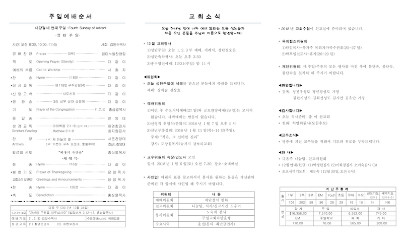 2017년 12월 24일 Publish on December 24,2017 | 교회사무실 페이지 정보 작성자 교회사무실 댓글 0건 조회 6,540회 작성일 17-12-24 13:51 목록 본문 이전글2017년 12월 31일 17.12.31 다음글2017년 12월 17일 17.12.24 댓글 0 댓글목록 등록된 댓글이 없습니다. 목록