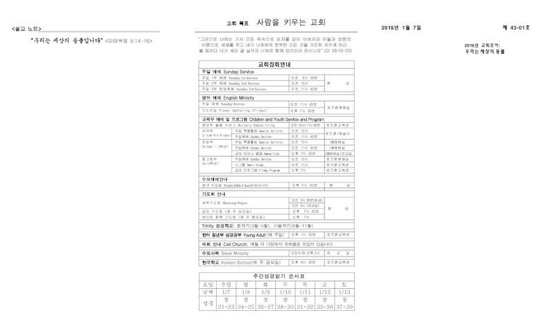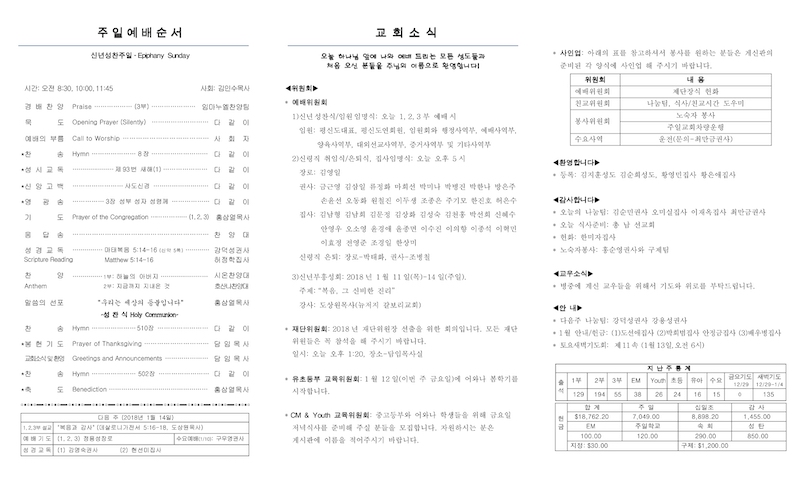 2018년 01월 07일 Publish on January 07,2018 | 교회사무실 페이지 정보 작성자 교회사무실 댓글 0건 조회 6,643회 작성일 18-01-07 11:15 목록 본문 이전글2018년 01월 14일 18.01.14 다음글2018신년부흥회 18.01.06 댓글 0 댓글목록 등록된 댓글이 없습니다. 목록