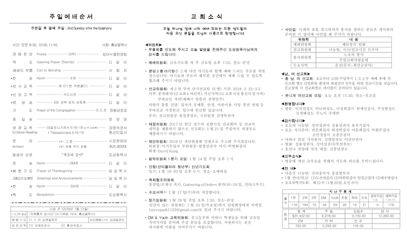 2018년 01월 14일 Publish on January 14,2018 | 교회사무실 페이지 정보 작성자 교회사무실 댓글 0건 조회 6,706회 작성일 18-01-14 11:13 목록 본문 이전글2018년 01월 21일 18.01.21 다음글2018년 01월 07일 18.01.07 댓글 0 댓글목록 등록된 댓글이 없습니다. 목록
