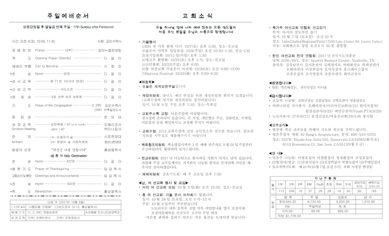 2017년 10월 01일 Publish on October 01,2017 | 교회사무실 페이지 정보 작성자 교회사무실 댓글 0건 조회 5,926회 작성일 17-10-01 11:02 목록 본문 이전글2017년 10월 08일 17.10.08 다음글2017년 09월 24일 17.09.24 댓글 0 댓글목록 등록된 댓글이 없습니다. 목록