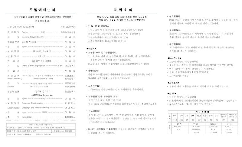 2017년 11월 19일 - 추수감사주일 Publish on November 19,2017 | 교회사무실 페이지 정보 작성자 교회사무실 댓글 0건 조회 5,986회 작성일 17-11-19 12:29 목록 본문 이전글2017년 11월 26일 17.11.26 다음글2017년 11월 12일 17.11.12 댓글 0 댓글목록 등록된 댓글이 없습니다. 목록