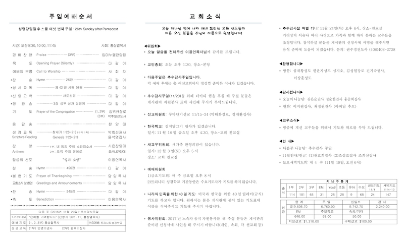 2016년 11월 13일 Publish on November 13,2016 | 교회사무실 페이지 정보 작성자 교회사무실 댓글 0건 조회 6,312회 작성일 16-11-13 11:06 목록 본문 이전글2016년 11월 20일 - 추수감사주일 16.12.04 다음글2016년 11월 6일 16.11.08 댓글 0 댓글목록 등록된 댓글이 없습니다. 목록