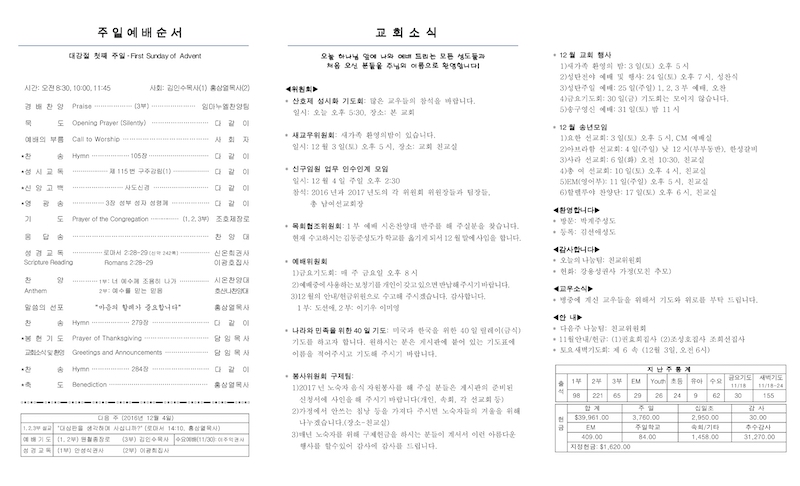 2016년 11월 27일 Publish on December 04,2016 | 교회사무실 페이지 정보 작성자 교회사무실 댓글 0건 조회 6,583회 작성일 16-12-04 12:38 목록 본문 이전글2016년 12월 4일 16.12.04 다음글2016년 11월 20일 - 추수감사주일 16.12.04 댓글 0 댓글목록 등록된 댓글이 없습니다. 목록
