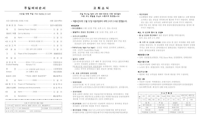 2017년 03월 05일 Publish on March 05,2017 | 교회사무실 페이지 정보 작성자 교회사무실 댓글 0건 조회 5,883회 작성일 17-03-05 11:33 목록 본문 이전글일일찻집 17.03.08 다음글2017년 02월 26일 17.02.26 댓글 0 댓글목록 등록된 댓글이 없습니다. 목록