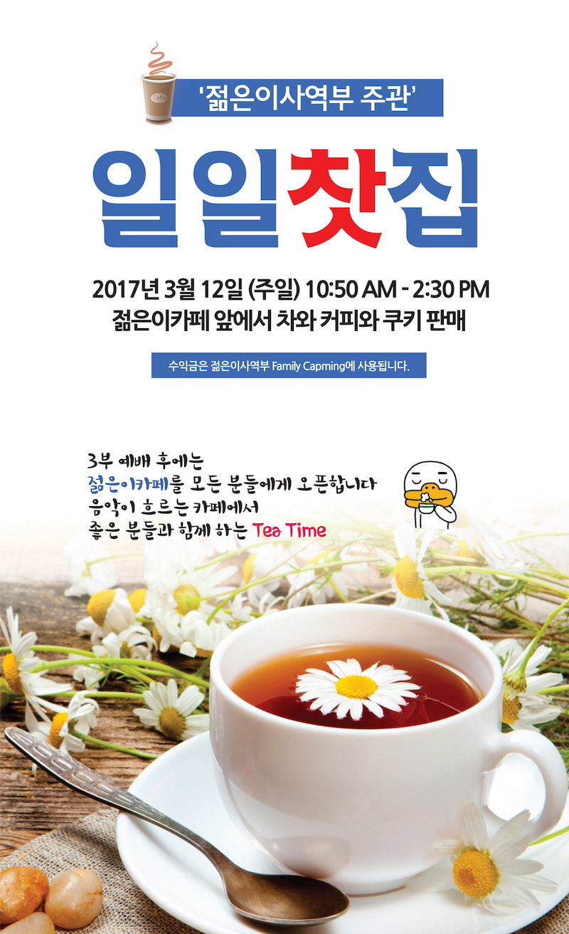 일일찻집 Publish on March 08,2017 | 관리자 페이지 정보 작성자 관리자 댓글 0건 조회 6,126회 작성일 17-03-08 12:11 목록 본문 젊은이 사역부 주관으로 일일 찻집이 열립니다. 3월 12일(주일) 10시50분~2시30분까지 이전글부모참관예배 및 부모교육 17.03.14 다음글2017년 03월 05일 17.03.05 댓글 0 댓글목록 등록된 댓글이 없습니다. 목록