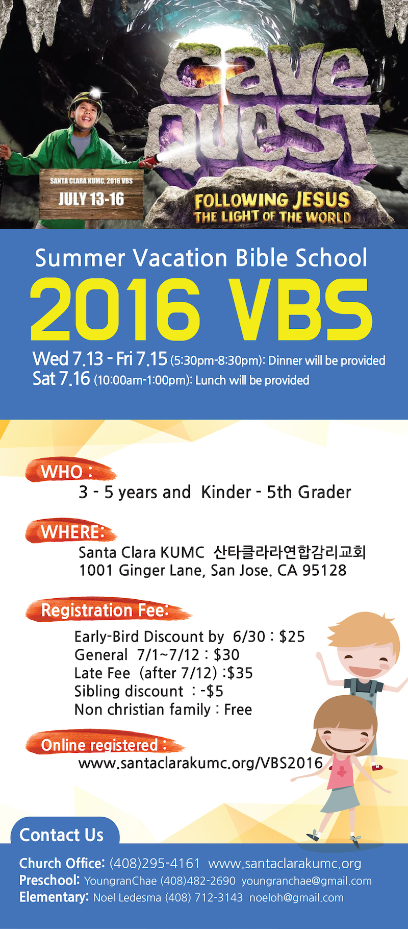 2016 VBS(여름성경학교) 가 아래와 같이 열립니다.