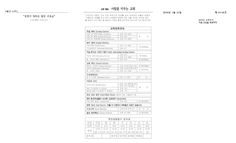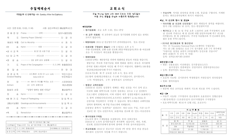 2016년 1월 31일 Publish on January 31,2016 | 교회사무실 페이지 정보 작성자 교회사무실 댓글 0건 조회 6,748회 작성일 16-01-31 13:39 목록 본문 이전글2016년 2월 7일 16.02.07 다음글2016년 1월 24일 16.01.24 댓글 0 댓글목록 등록된 댓글이 없습니다. 목록