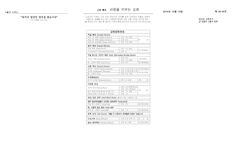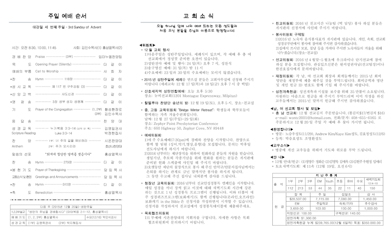 2015년 12월 13일 Publish on December 13,2015 | 교회사무실 페이지 정보 작성자 교회사무실 댓글 0건 조회 6,595회 작성일 15-12-13 10:52 목록 본문 이전글2015년 12월 20일 성탄주일 15.12.20 다음글12월 선교김치 주문 받습니다. 15.12.12 댓글 0 댓글목록 등록된 댓글이 없습니다. 목록
