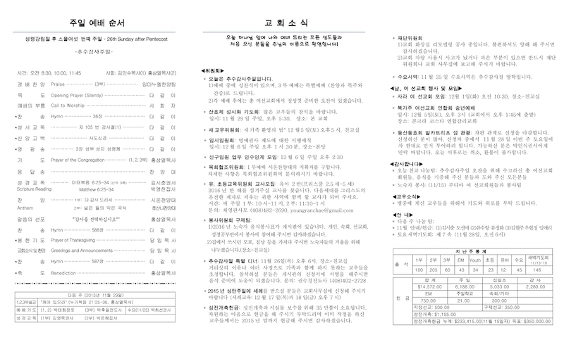 2015년 11월 22일-추수감사주일 Publish on November 22,2015 | 교회사무실 페이지 정보 작성자 교회사무실 댓글 0건 조회 6,434회 작성일 15-11-22 11:54 목록 본문 이전글2015년 11월 29일 15.12.01 다음글1부 시온찬양대의 지휘자를 구합니다. 15.11.16 댓글 0 댓글목록 등록된 댓글이 없습니다. 목록