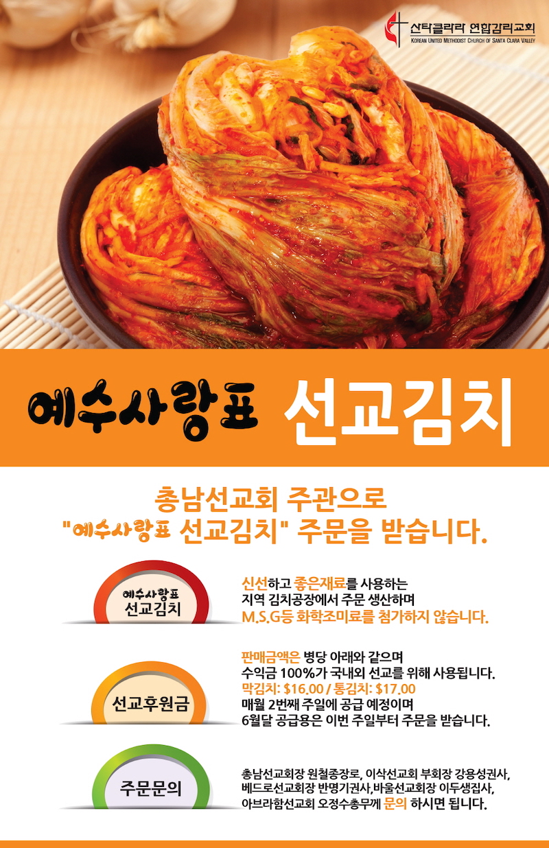 7월 "예수사랑표 선교김치" 주문을 오늘 부터 다음주일까지 받습니다. (썬김치 $16.00/통김치$17.00) 친교실 앞에 놓여있는 주문서에 주문내용을 기입해 주세요.