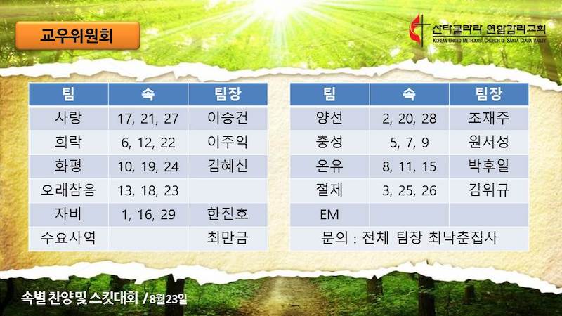 속별 찬양 및 스킷대회 Publish on May 30,2015 | 관리자 페이지 정보 작성자 관리자 댓글 0건 조회 6,594회 작성일 15-05-30 00:48 목록 본문 속별 찬양 및 스킷대회 열심히 준비하시어 하나님 기뻐하시는 천국 잔치가 되기를 바랍니다. 이전글6월 행사안내 15.05.30 다음글한국학교 2015년 가을학기 등록 15.05.30 댓글 0 댓글목록 등록된 댓글이 없습니다. 목록
