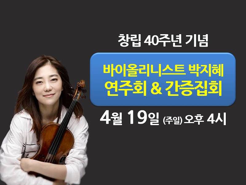 창립 40주년 기념으로 세계적인 바이얼리니스트 박지혜 자매의 연주 및 간증집회가 아래와 같이 열립니다.