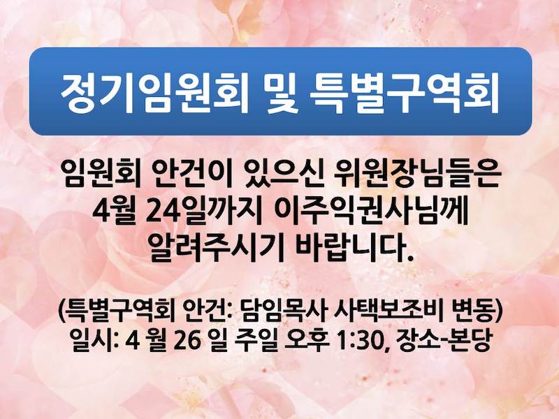 (특별구역회 안건: 담임목사 사택보조비 변동) 일시: 4 월 26 일 주일 오후 1:30, 장소-본당