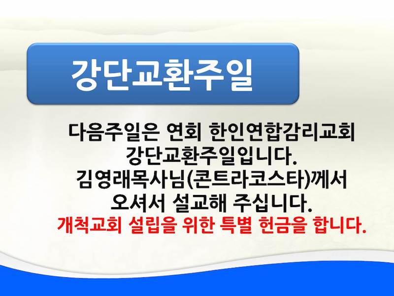 강단교환주일 Publish on February 11,2015 | 관리자 페이지 정보 작성자 관리자 댓글 0건 조회 5,927회 작성일 15-02-11 16:59 목록 본문 다음주일은 연회 한인연합감리교회 강단교환주일입니다.김영래목사님(콘트라코스타)께서 오셔서 설교해 주십니다. 개척교회 설립을 위한 특별 헌금을 합니다. 이전글2015년 2월 15일 15.02.15 다음글사랑 페스티발 15.02.11 댓글 0 댓글목록 등록된 댓글이 없습니다. 목록