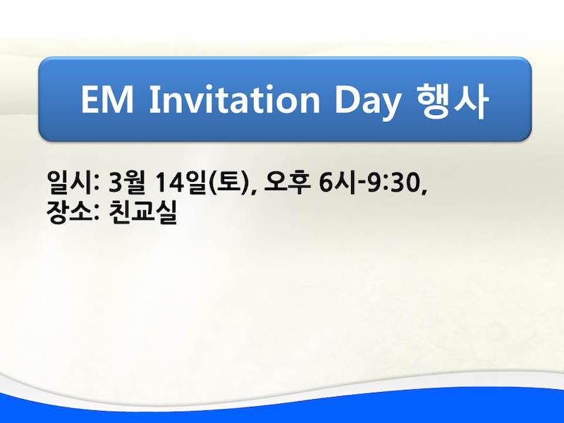 EM Invitation Day 행사 Publish on March 05,2015 | 관리자 페이지 정보 작성자 관리자 댓글 0건 조회 5,829회 작성일 15-03-05 23:42 목록 본문 EM Invitation Day 행사일시: 3월 14일(토), 오후 6시-9:30, 장소: 친교실 이전글북가주 연합 감리교 여선교회 연합 바자회 15.03.11 다음글2015년 3월 1일 15.03.01 댓글 0 댓글목록 등록된 댓글이 없습니다. 목록