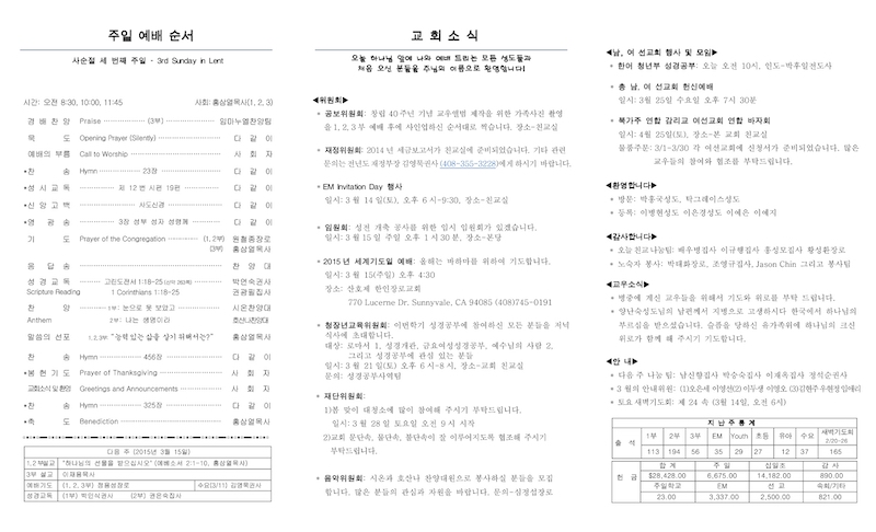 2015년 3월 8일 Publish on March 08,2015 | 교회사무실 페이지 정보 작성자 교회사무실 댓글 0건 조회 5,822회 작성일 15-03-08 10:31 목록 본문 이전글임시 임원회 15.03.11 다음글북가주 연합 감리교 여선교회 연합 바자회 15.03.11 댓글 0 댓글목록 등록된 댓글이 없습니다. 목록