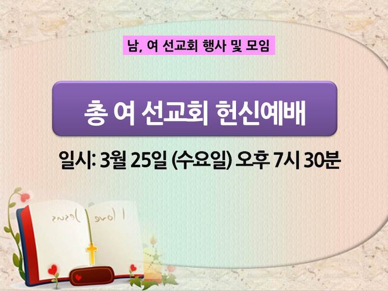 총 여 선교회 헌신예배 Publish on March 11,2015 | 관리자 페이지 정보 작성자 관리자 댓글 0건 조회 6,035회 작성일 15-03-11 15:20 목록 본문 총 여 선교회 헌신예배일시: 3월 25일 (수요일) 오후 7시 30분 이전글2015년 3월 15일 15.03.15 다음글봄맞이 대청소 15.03.11 댓글 0 댓글목록 등록된 댓글이 없습니다. 목록