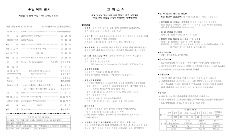 2015년 3월 15일 Publish on March 15,2015 | 교회사무실 페이지 정보 작성자 교회사무실 댓글 0건 조회 5,854회 작성일 15-03-15 10:43 목록 본문 이전글2015년 3월 22일 15.03.22 다음글총 여 선교회 헌신예배 15.03.11 댓글 0 댓글목록 등록된 댓글이 없습니다. 목록