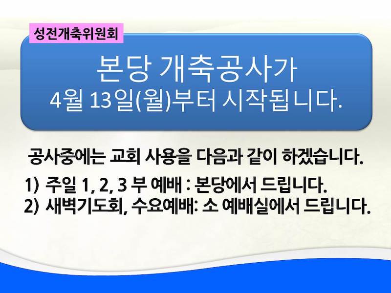 공사중에는 교회 사용을 다음과 같이 하겠습니다.