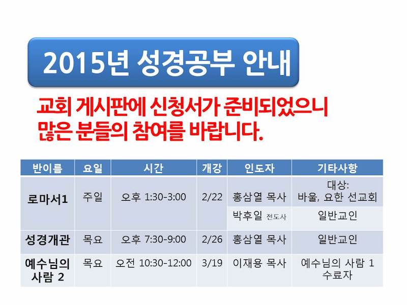 2015년 성경공부 안내 Publish on February 11,2015 | 관리자 페이지 정보 작성자 관리자 댓글 0건 조회 5,938회 작성일 15-02-11 16:51 목록 본문 2015년 성경공부 안내교회 게시판에 신청서가 준비되었으니 많은 분들의 참여를 바랍니다. 이전글전도훈련모임 15.02.11 다음글2015년 2월 8일 15.02.08 댓글 0 댓글목록 등록된 댓글이 없습니다. 목록