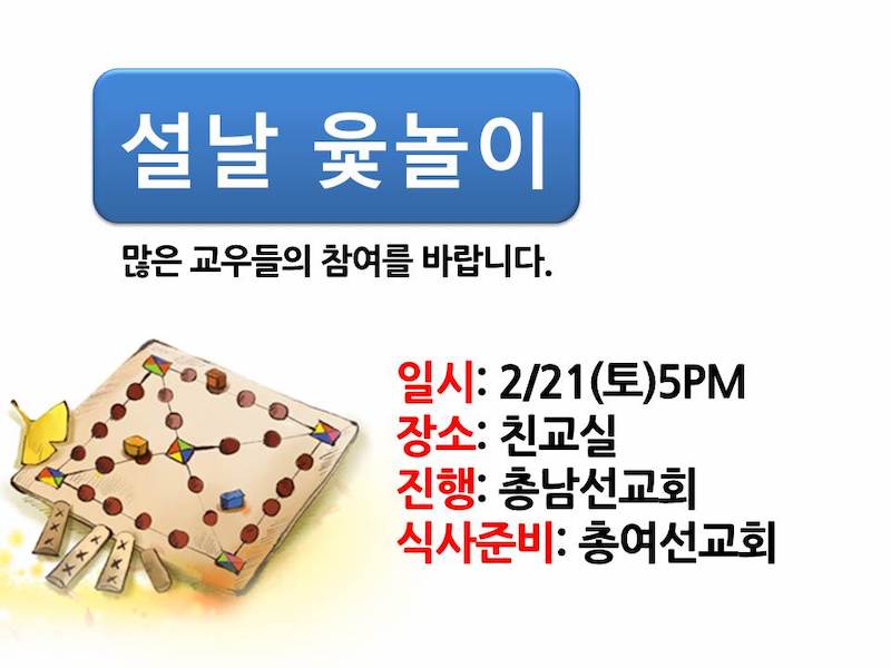 설날 윷놀이 Publish on February 11,2015 | 관리자 페이지 정보 작성자 관리자 댓글 0건 조회 6,125회 작성일 15-02-11 16:57 목록 본문 설날 윷놀이많은 교우들의 참여를 바랍니다. 일시: 2/21(토)5PM 장소: 친교실진행: 총남선교회식사준비: 총여선교회 이전글사랑 페스티발 15.02.11 다음글전도훈련모임 15.02.11 댓글 0 댓글목록 등록된 댓글이 없습니다. 목록