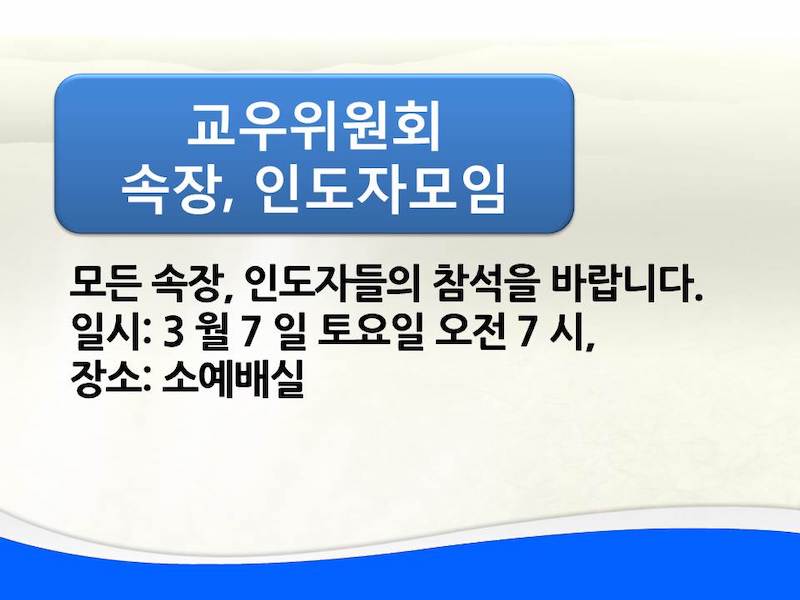 속장, 인도자모임 Publish on February 26,2015 | 관리자 페이지 정보 작성자 관리자 댓글 0건 조회 5,873회 작성일 15-02-26 21:02 목록 본문 속장, 인도자모임모든 속장, 인도자들의 참석을 바랍니다. 일시: 3 월 7 일 토요일 오전 7 시, 장소: 소예배실 이전글2015년 3월 1일 15.03.01 다음글2월 27일 금요일 행사 15.02.26 댓글 0 댓글목록 등록된 댓글이 없습니다. 목록