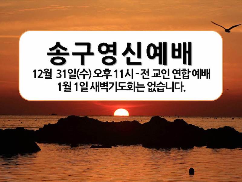 송구영신예배 Publish on December 31,2014 | 관리자 페이지 정보 작성자 관리자 댓글 0건 조회 6,302회 작성일 14-12-31 01:46 목록 본문 송구영신예배 12월 31일(수) 오후 11시 - 전 교인 연합 예배 1월 1일 새벽기도회는 없습니다. 이전글2015년 1월 4일 15.01.04 다음글2015년 신년 특별 새벽 기도회 14.12.31 댓글 0 댓글목록 등록된 댓글이 없습니다. 목록