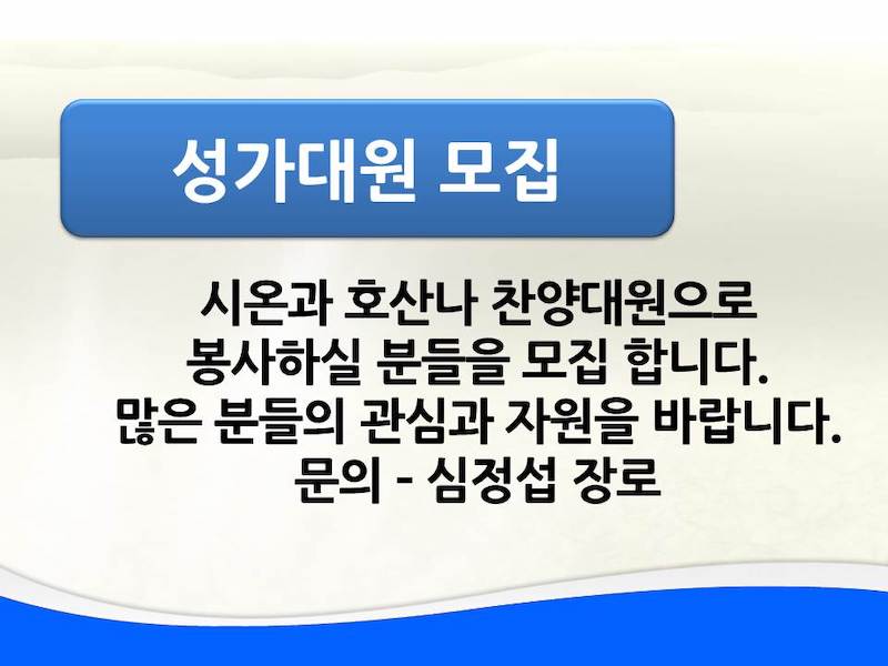 성가대원 모집 Publish on February 01,2015 | 관리자 페이지 정보 작성자 관리자 댓글 0건 조회 6,309회 작성일 15-02-01 23:35 목록 본문 성가대원 모집시온과 호산나 찬양대원으로 봉사하실 분들을 모집 합니다. 많은 분들의 관심과 자원을 바랍니다. 문의 – 심정섭 장로 이전글퍼스펙티브스 산호세 342기 15.02.01 다음글2015년 1월 25일 15.01.25 댓글 0 댓글목록 등록된 댓글이 없습니다. 목록