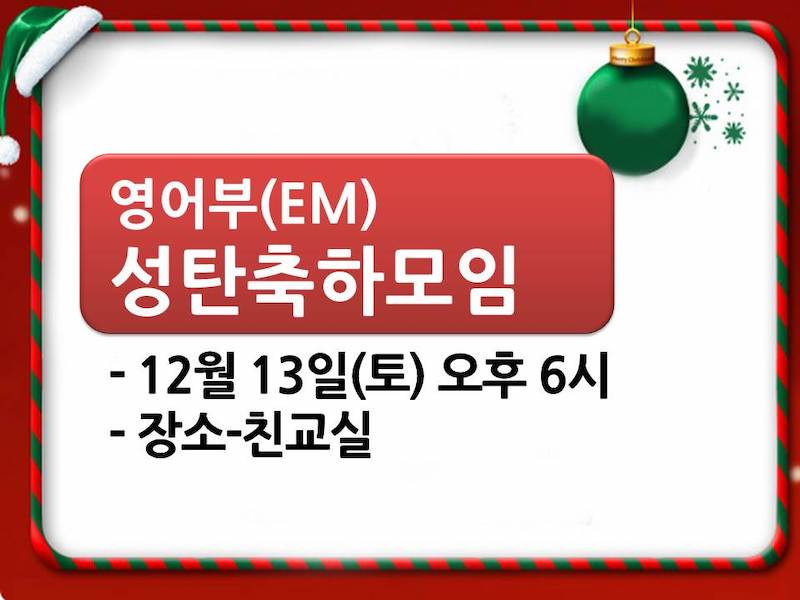 영어부(EM) 성탄축하모임 Publish on December 07,2014 | 관리자 페이지 정보 작성자 관리자 댓글 0건 조회 7,232회 작성일 14-12-07 17:05 목록 본문 영어부(EM) 성탄축하모임- 12월 13일(토) 오후 6시- 장소-친교실 이전글친교위원회 소식 14.12.15 다음글산호제 교회협의회 성탄 연합예배 14.12.07 댓글 0 댓글목록 등록된 댓글이 없습니다. 목록