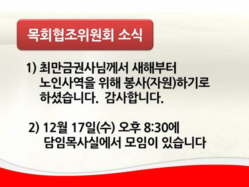 목회협조위원회 소식 Publish on December 15,2014 | 관리자 페이지 정보 작성자 관리자 댓글 0건 조회 6,450회 작성일 14-12-15 18:03 목록 본문 - 최만금권사님께서 새해부터 노인사역을 위해 봉사(자원)하기로 하셨습니다. 감사합니다.- 12월 17일(수) 오후 8:30에 담임목사실에서 모임이 있습니다 이전글예배위원회의 밤 14.12.15 다음글친교위원회 소식 14.12.15 댓글 0 댓글목록 등록된 댓글이 없습니다. 목록