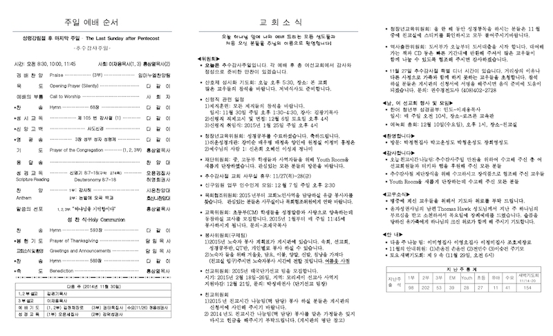 2014년 11월 23일 추수감사주일 Publish on November 23,2014 | 교회사무실 페이지 정보 작성자 교회사무실 댓글 0건 조회 6,550회 작성일 14-11-23 12:47 목록 본문 이전글성경공부를 수료 14.11.25 다음글2014년 11월 16일 14.11.21 댓글 0 댓글목록 등록된 댓글이 없습니다. 목록
