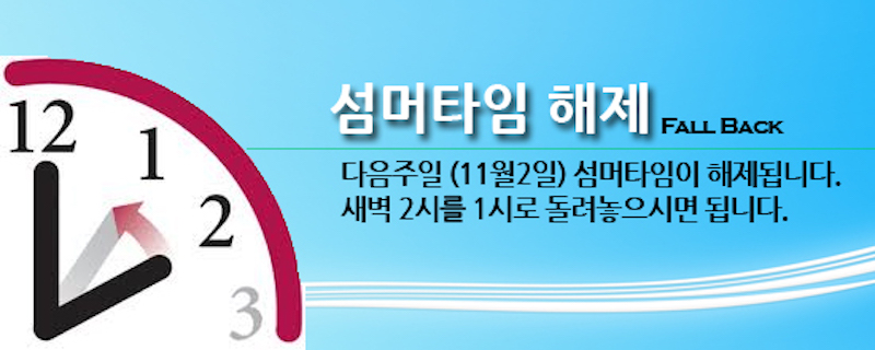 섬머타임해제 Publish on October 27,2014 | 관리자 페이지 정보 작성자 관리자 댓글 0건 조회 6,735회 작성일 14-10-27 09:53 목록 본문 Fall Back 섬머타임 해제다음주일 (11월2일) 섬머타임이 해제됩니다.새벽 2시를 1시로 돌련놓으시면 됩니다. 이전글2014년 10월 26일 14.10.30 다음글북한인권국제영화제 & 간증집회 14.11.03 댓글 0 댓글목록 등록된 댓글이 없습니다. 목록