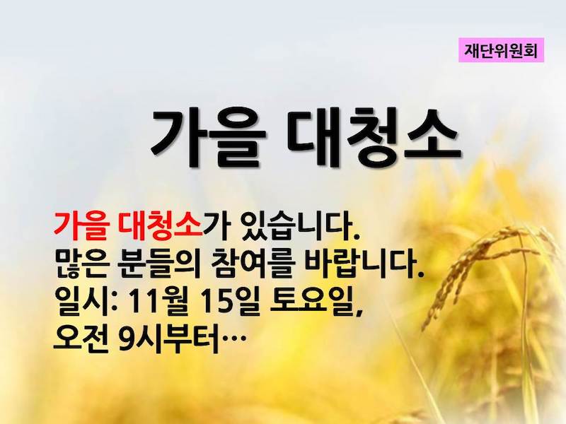 가을 대청소 Publish on November 06,2014 | 관리자 페이지 정보 작성자 관리자 댓글 0건 조회 6,514회 작성일 14-11-06 01:34 목록 본문 가을 대청소가 있습니다. 많은 분들의 참여를 바랍니다. 일시: 11월 15일 토요일, 오전 9시부터… 이전글교인 총회 14.11.06 다음글속장/인도자 모임 14.11.06 댓글 0 댓글목록 등록된 댓글이 없습니다. 목록
