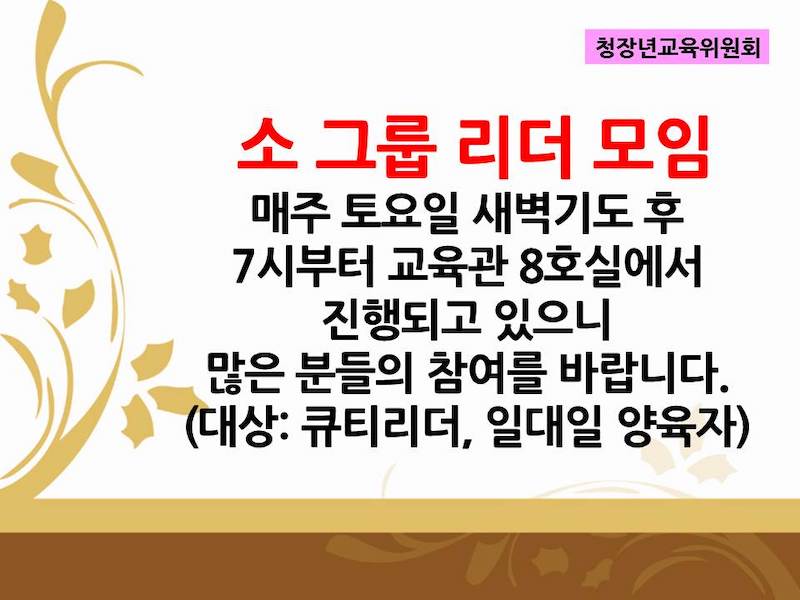 소 그룹 리더 모임 Publish on November 06,2014 | 관리자 페이지 정보 작성자 관리자 댓글 0건 조회 6,552회 작성일 14-11-06 01:36 목록 본문 소 그룹 리더 모임매주 토요일 새벽기도 후 7시부터 교육관 8호실에서 진행되고 있으니 많은 분들의 참여를 바랍니다. (대상: 큐티리더, 일대일 양육자) 이전글태국단기선교팀 모집 14.11.06 다음글교인 총회 14.11.06 댓글 0 댓글목록 등록된 댓글이 없습니다. 목록